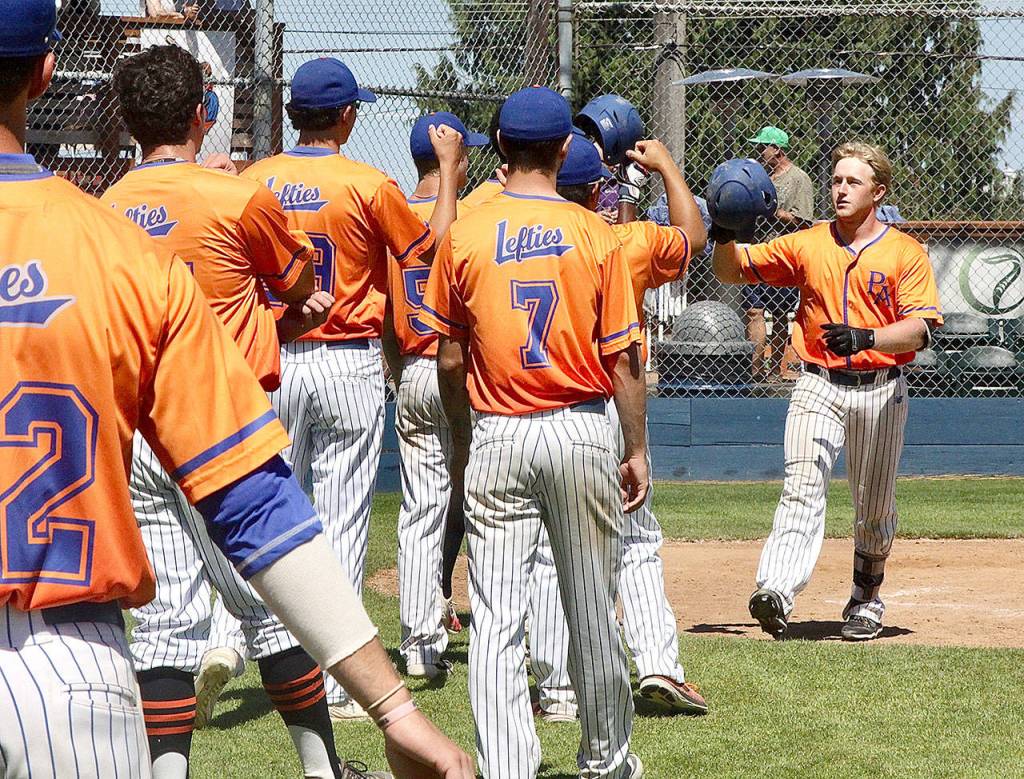 The Lefties’ Evan Hurn, at right, of Sequim, receives congratulations from his teammates after hitting a home run in Port Angeles’ 8-6 win Sunday over Kelowna at Civic Field. (Dave Logan/for Peninsula Daily News)