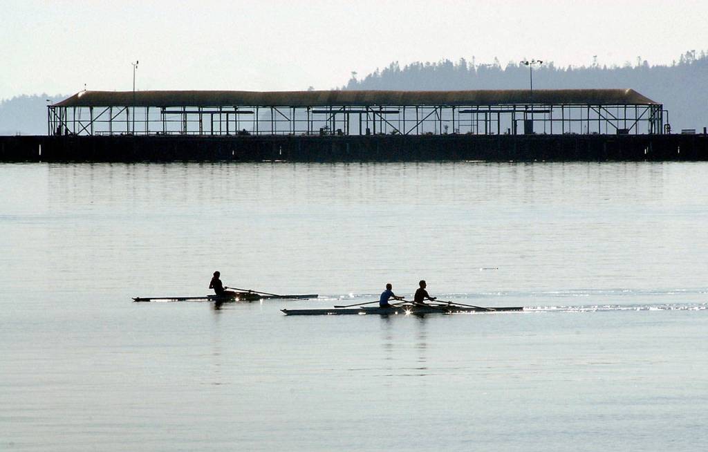 A pair of sculls make their way across Port Angeles Harbor against a backdrop of the former Rayonier Paper Mill dock Thursday morning.