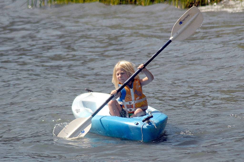 LAKE CRESCENT — Skagit Williams, 6, of Joyce shows grim determination as he paddles a small kayak at Log Cabin Resort on Lake Crescent in Olympic National Park on Wednesday.