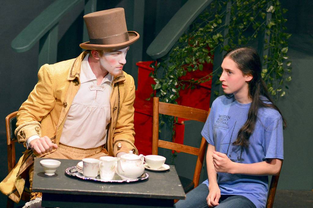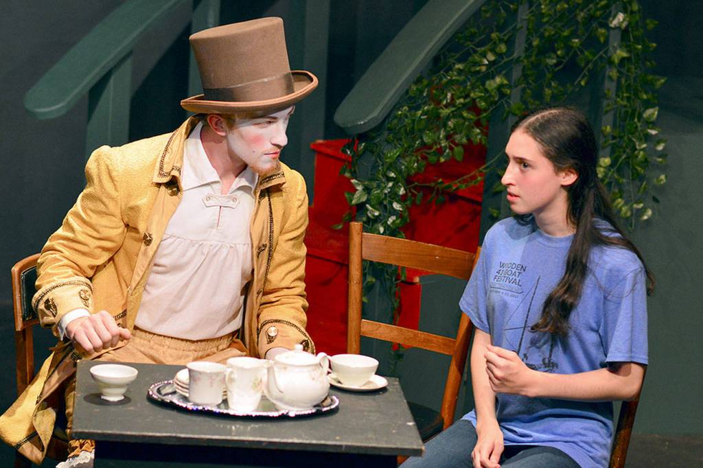 The Mad Hatter (Orion Pendley) mystifies Alice (Grace Wentzel) in “Alice in Wonderland,” the Teen Initiative production at Port Townsend’s Key City Public Theatre this weekend. (Diane Urbani de la Paz/for Peninsula Daily News)