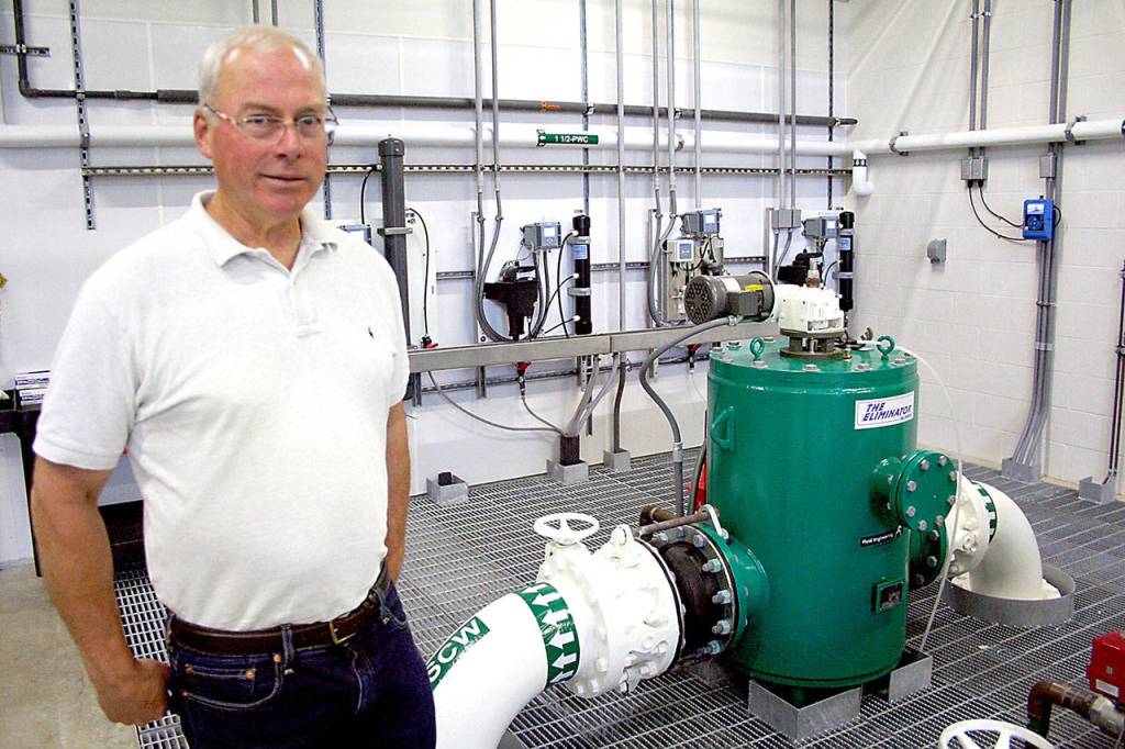 Port Townsend Water Resources Manager Ian Jablonski provides a tour of the city’s water treatment facility in July. The city took a sample from the facility last week after the chemical spraying near City Lake, and glyphosate was not found in it. (Brian McLean/Peninsula Daily News)
