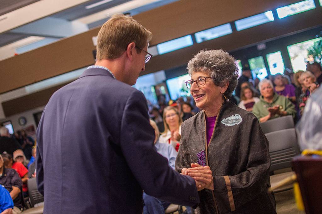 U.S. Rep. Derek Kilmer hands a pin to Shele Kinkead of Forks during a pinning ceremony for Vietnam War Era veterans at Peninsula College in Forks on Wednesday. Kinkead accepted the pin for her late husband who served in the U.S. Coast Guard during the Vietnam War. (Jesse Major/Peninsula Daily News)