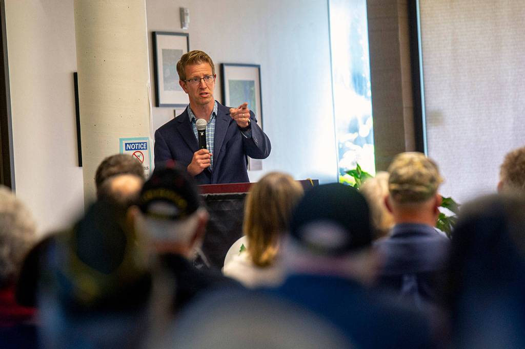 U.S. Rep. Derek Kilmer, D-Gig Harbor, thanks Vietnam War Era veterans during a pinning ceremony at Peninsula College in Forks. (Jesse Major/Peninsula Daily News)
