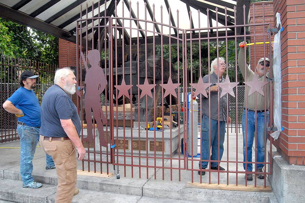 PORT ANGELES — Bruce Selleg, right, takes a measurement during Wednesday’s installation of the first of six decorative gates designed to guard the Liberty Bell replica at Veterans Memorial Park in Port Angeles as Richard Stephens, left, and gate artists Gray Lucier and Bob Stokes wait to make leveling adjustments.