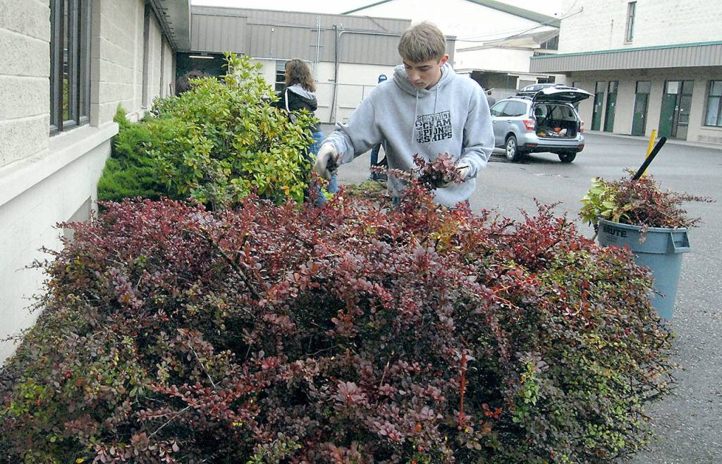 As part of Saturday’s Day of Caring, hosted by United Way of Clallam County, more than a dozen students and adults took time to trim shrubs, weed planters and sweep sidewalks. The city of Sequim also participated in the United Way Day of Caring with a project cleaning up Carrie Blake Park.