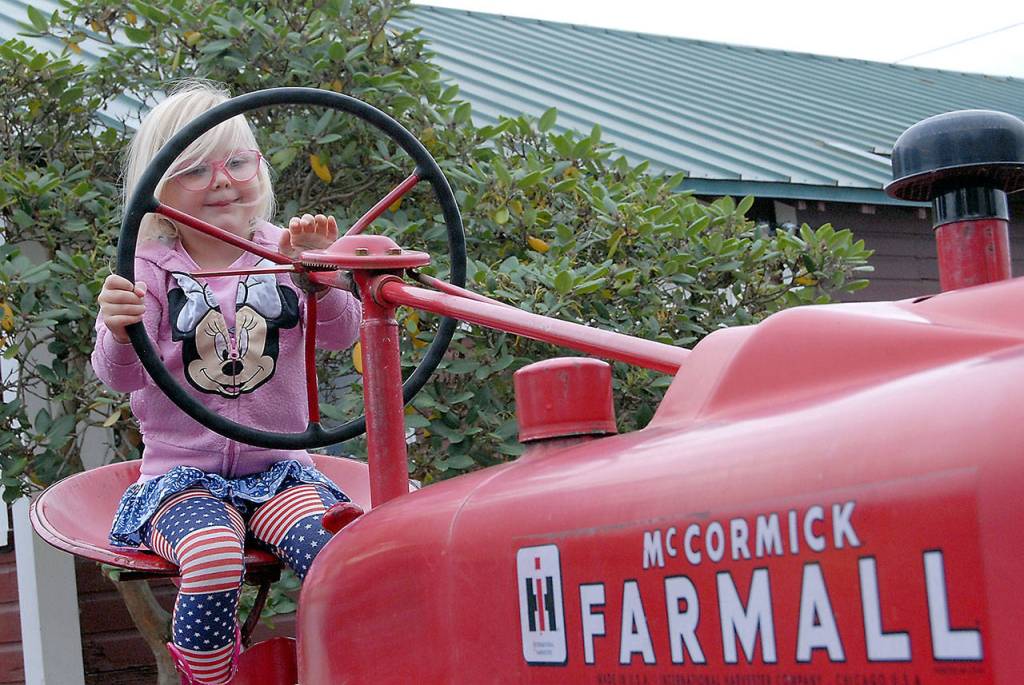 Three-year-old Lydia Lewis of Port Angeles sits on a vintage McCormick Farmall tractor on display at Agnew Grocery in Agnew on Saturday during Saturday’s 23rd annual Clallam Farm Tour. (Keith Thorpe/Peninsula Daily News)