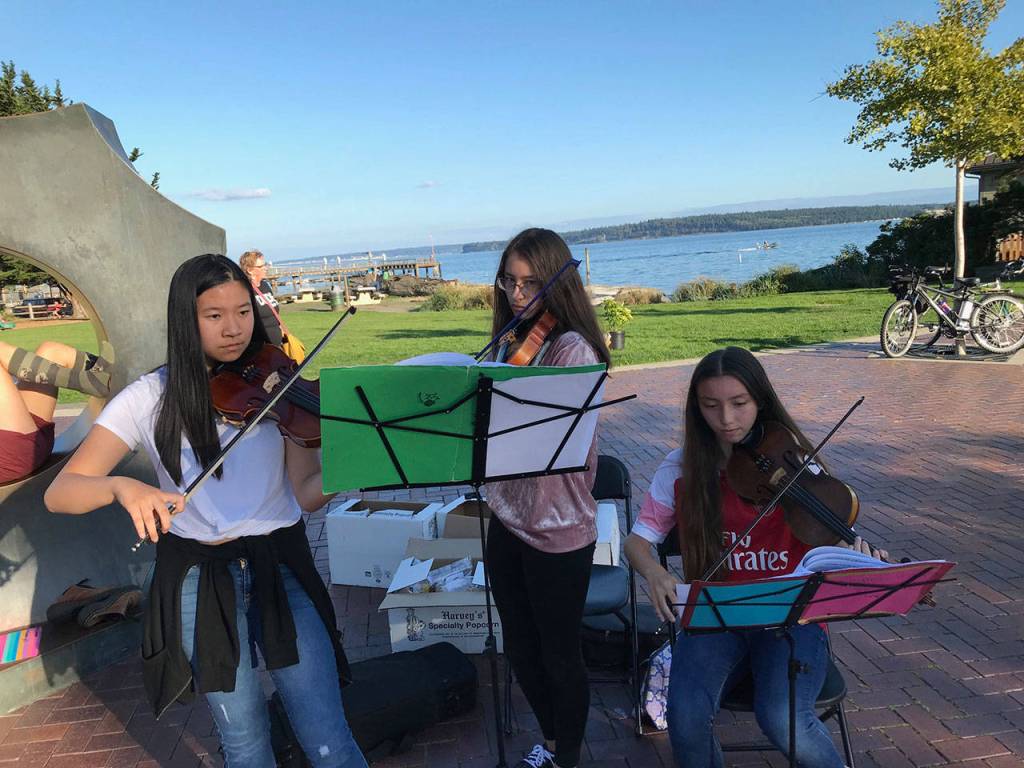 Port Townsend High School orchestra students Leona Lee, left, Kerith Pray and Kaylen Pray perform near Pope Marine Park on Water Street during the Port Townsend Film Festival to help raise money for their trip to Los Angeles in the spring. (Daniel Ferland)