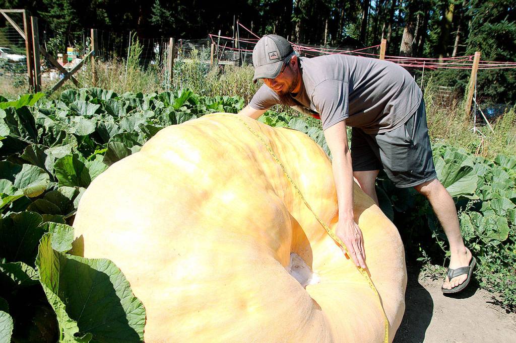 The orange bulbous gourd, known as Gertrude, looked cartoonish sitting behind a home just southeast of Coupeville, although she’s often covered to protect her from getting too much sun. The Atlantic giant pumpkin weighs 1,045 pounds, according to gardener Ryan Nefcy.
