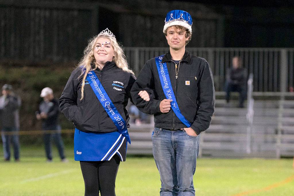 Chimacum’s Homecoming Queen Grace Graham and King Stephen Caulkins present themselves to assembled family and friends during half-time of a game against Charles Wright Academy on Friday at Memorial Field.