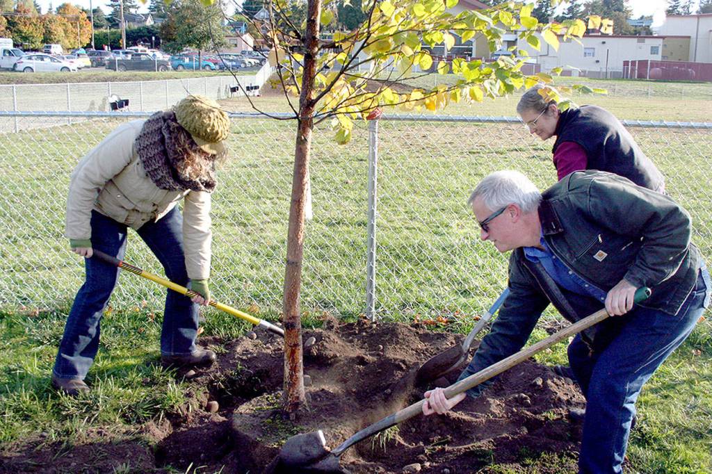 They got together Friday morning at the west end of the Mountain View Dog Park to plant three paper birch trees at 1925 Blaine St., Port Townsend.