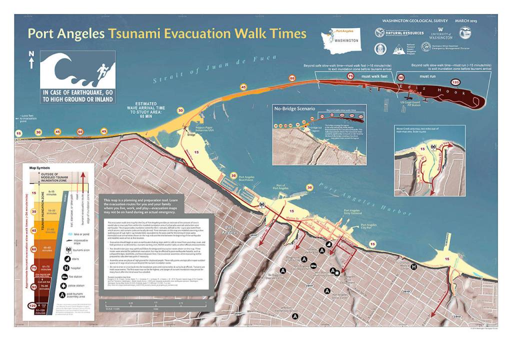 In Port Angeles, it is estimated to take anywhere from 15 minutes to two hours if on Ediz Hook (where the map recommends running instead of walking) to exit the inundation zone.
