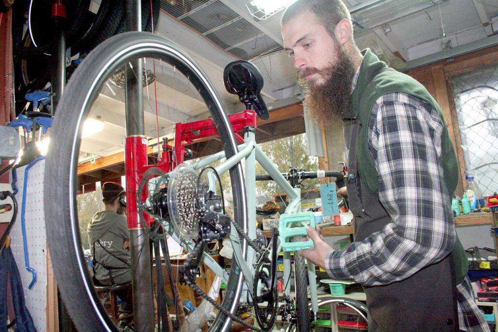 PORT TOWNSEND — Joe Sastic, a mechanic for The ReCyclery, watches the chain mechanism on a bicycle Wednesday afternoon at the nonprofit shop at 1925 Blaine St.