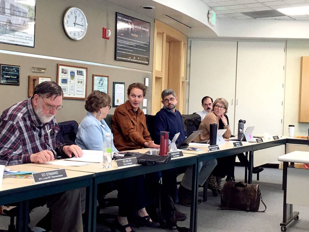 Clallam Transit board members, from left, Ted Miller, Candace Pratt, Lindsey Schromen-Wawrin, Mark Ozias, Kate Dexter and Bill Peach discuss potential impacts of state Initiative 976. (Rob Ollikainen/Peninsula Daily News)