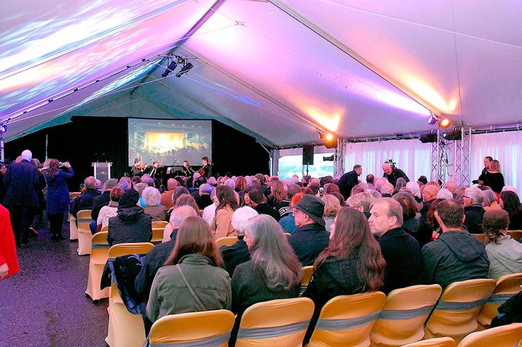 The evening’s invitation-only ceremony at the center’s site at Front and Oak streets on the Port Angeles waterfront marked the occasion under a tent filled with officials, organizers, donors and friends of the performing arts center.