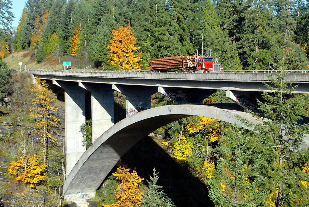 A logging truck makes its way over the state Highway 112 bridge over the Elwha River west of Port Angeles on Tuesday as autumn’s colors near their peak across the North Olympic Peninsula.