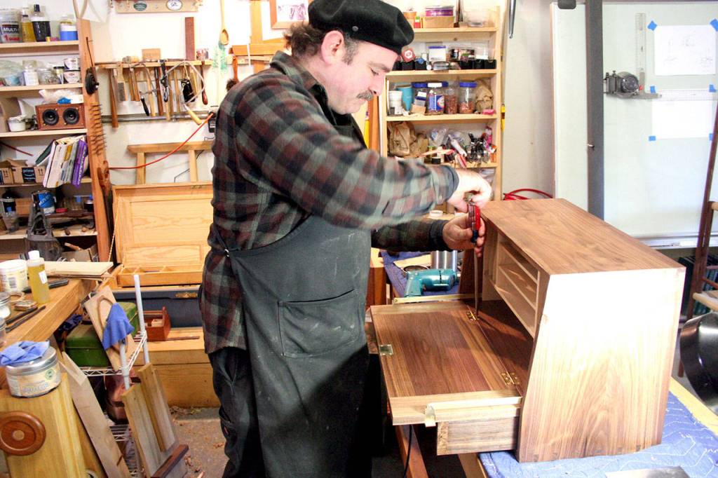 PORT TOWNSEND — From his two-story workshop, Matthew Straughn-Morse softly used a small hammer to remove the main piece from a secretary desk made of black walnut.