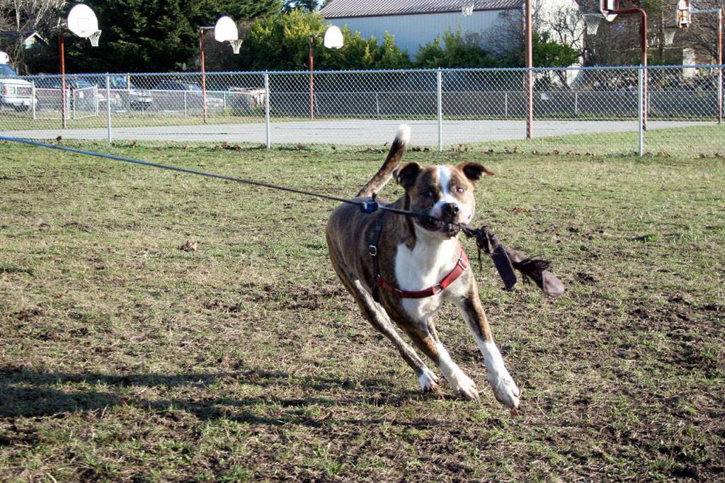 Eliza Staten of Port Townsend brought a toy connected to a long pole and swirled it around her head as Jasper, her pit bull mix, chased it down.