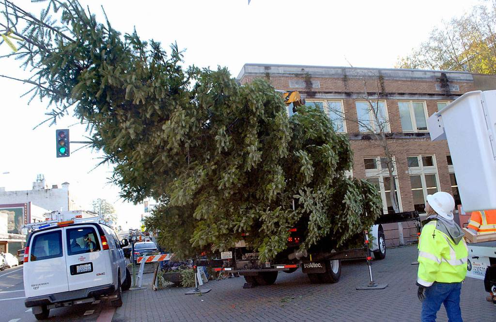 The 30-foot-tall fir tree was donated by Kim Weimer of Port Angeles and will be decorated in time for a tree-lighting ceremony Saturday, Nov. 30.