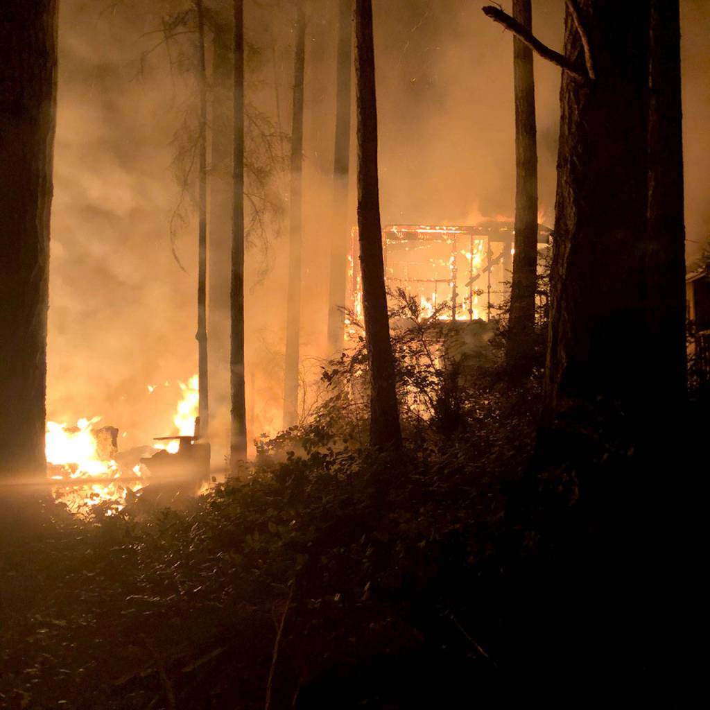 Volunteer firefighters from the Quilcene Fire Rescue station 22 in Coyle were the first to arrive at the fire at Alder Street on the southern end of the Toandos Peninsula after receiving the dispatch call shortly before 9 p.m. Monday night, Quilcene Fire Chief Frank Montone said.