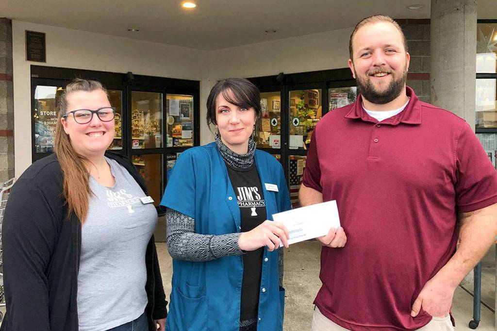 Jim’s Pharmacy in Port Angeles recently donated $500 to the Northwest Veterans Resource Center, its November charity of the month. Pictured are Jim’s customer service representatives Julie Kinmond and Sarah Abbitt, giving a check to Levi Douglas, an administrative assistant at the center.