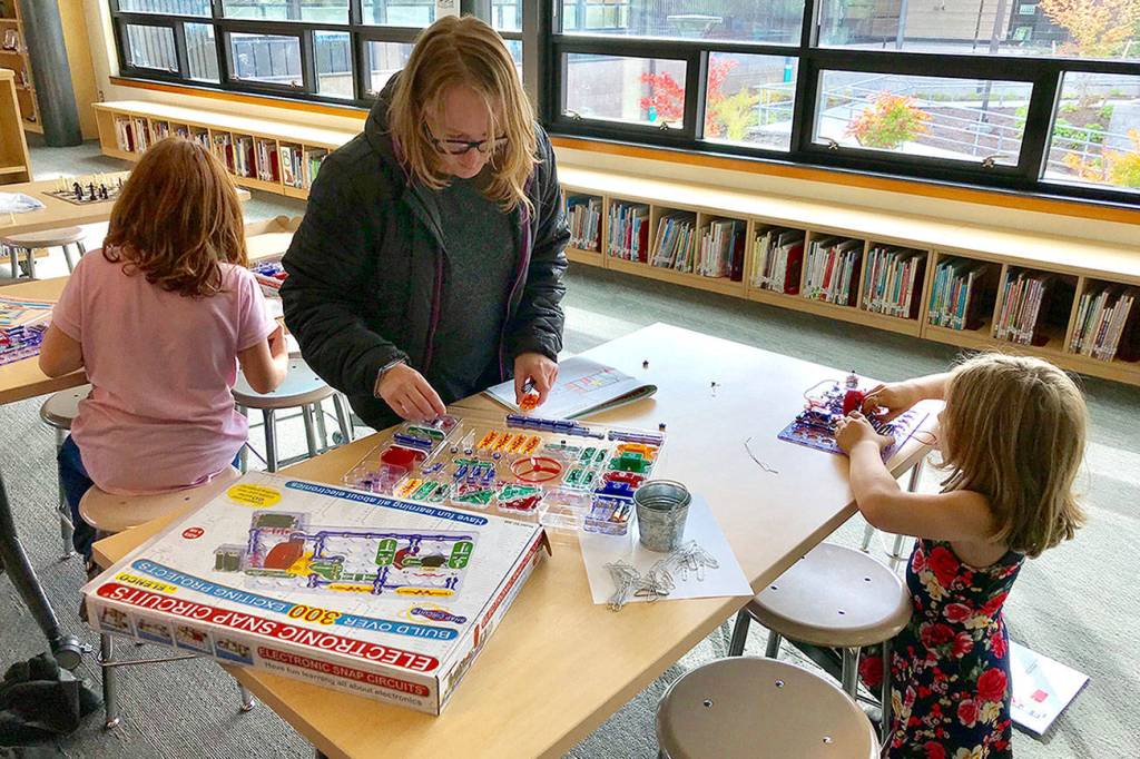 Youth Services Library Manager Hilary Verheggen leads two Salish Coast Elementary School students in a lesson on how to create snap circuits. The snap circuits have been so popular at the Salish After Hours program that organizers had to buy more sets, Port Townsend library director Melody Eisler said. (Port Townsend Public Library)
