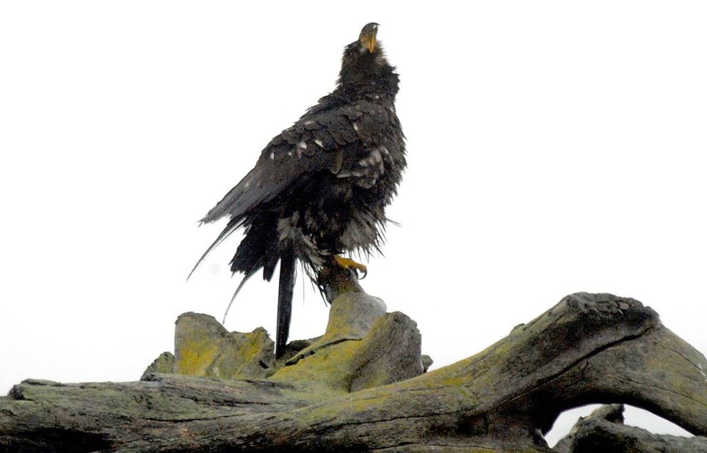 PORT ANGELES —A juvenile bald eagle shakes the rain from its feathers from its perch on a piece of driftwood on Ediz Hook in Port Angeles.