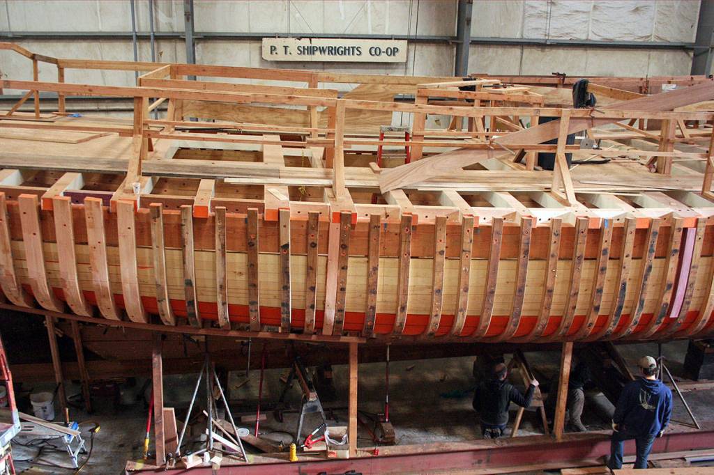 The Western Flyer, made famous by John Steinbeck and Ed Ricketts in the book “Sea of Cortez: A Leisurely Journal of Travel and Research,” fills up one of the rooms. Jordan Bard and Greg Friedrichs worked Monday on tightening several boards during the ongoing restoration project.