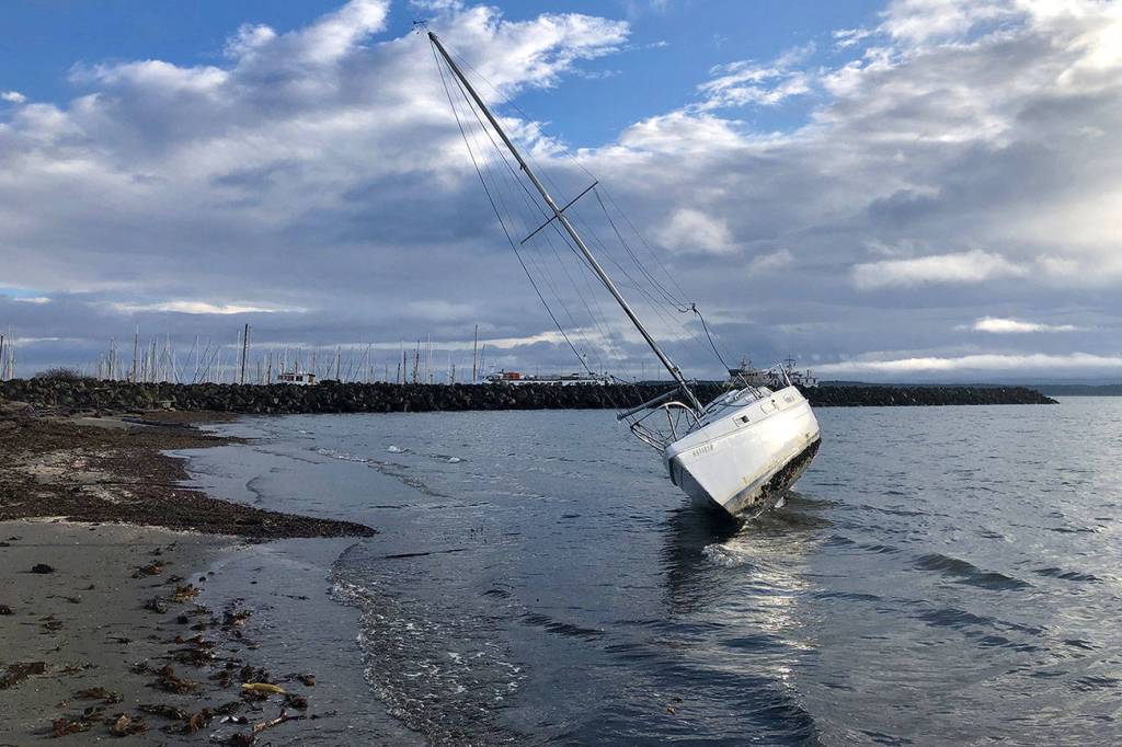 PORT TOWNSEND — A boat that was anchored in Port Townsend Bay for several months is seen Sunday after breaking anchor and getting pushed to the beach at the Port Townsend Boat Haven.