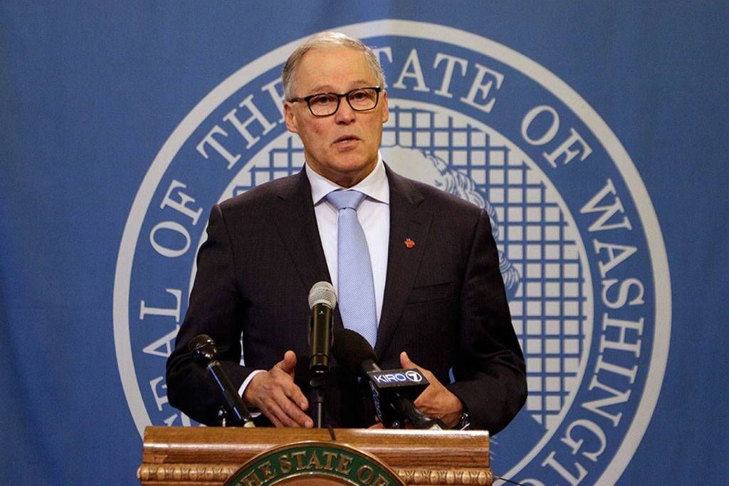 Washington Gov. Jay Inslee talks to the media after a state Supreme Court ruling that reinstated a severely limited version of his plan to cap carbon pollution in the state in Olympia. He said the ruling just strengthens his commitment to get climate change-related bills through the Legislature this year. (Rachel La Corte/The Asociated Press)