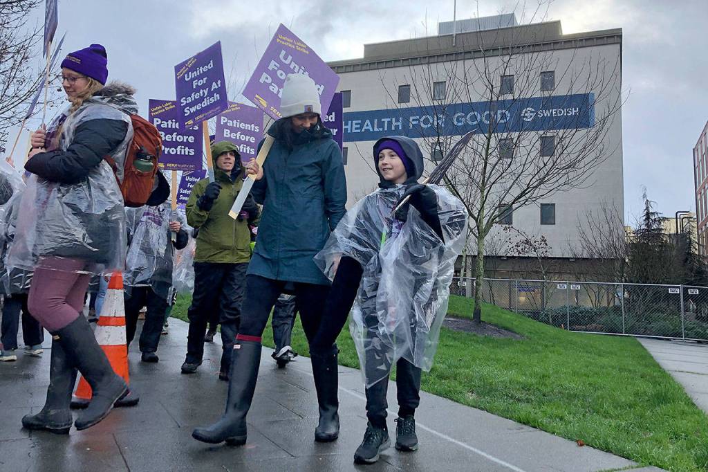 The picketers took to the sidewalks in front of Swedish Medical Center campuses wearing clear plastic ponchos against a heavy morning rain and carrying purple signs that read “Patients Before Profits” and “United For Our Patients.”