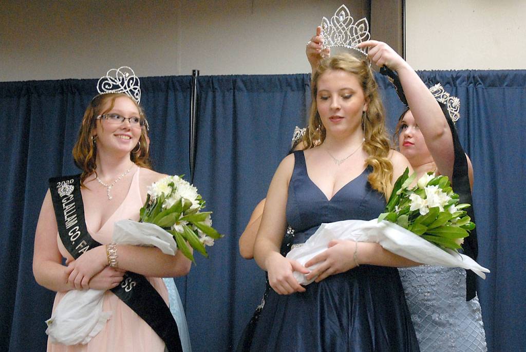 PORT ANGELES — The 2020 Clallam County Fair Queen Anna Menkal receives her crown from 2019 Queen Saydee Peters as 2020 Princess Hannah McDaniel looks on, at left, during Saturday’s coronation at the Clallam County Fairgrounds in Port Angeles.