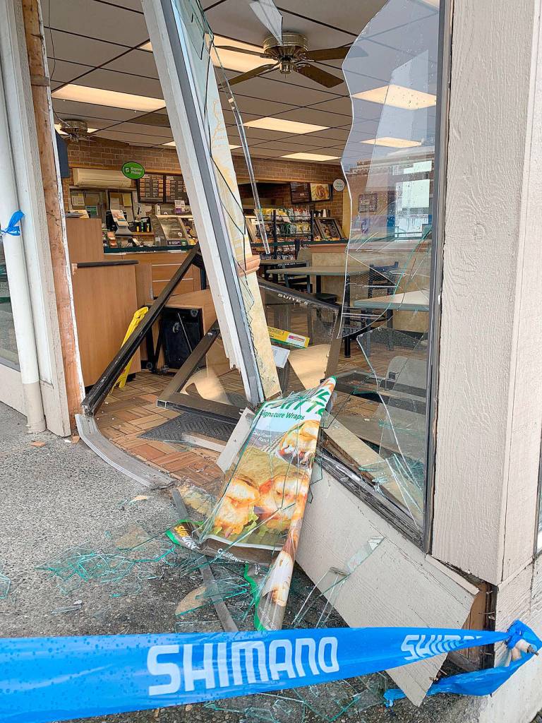 A customer rammed into the front entrance to the Subway franchise on Lincoln Street in Port Angeles on Saturday morning with their vehicle, said manager, Becky Tunstall, who stayed open but served only to-go orders until the front was boarded up later that day. She said it was an accident.