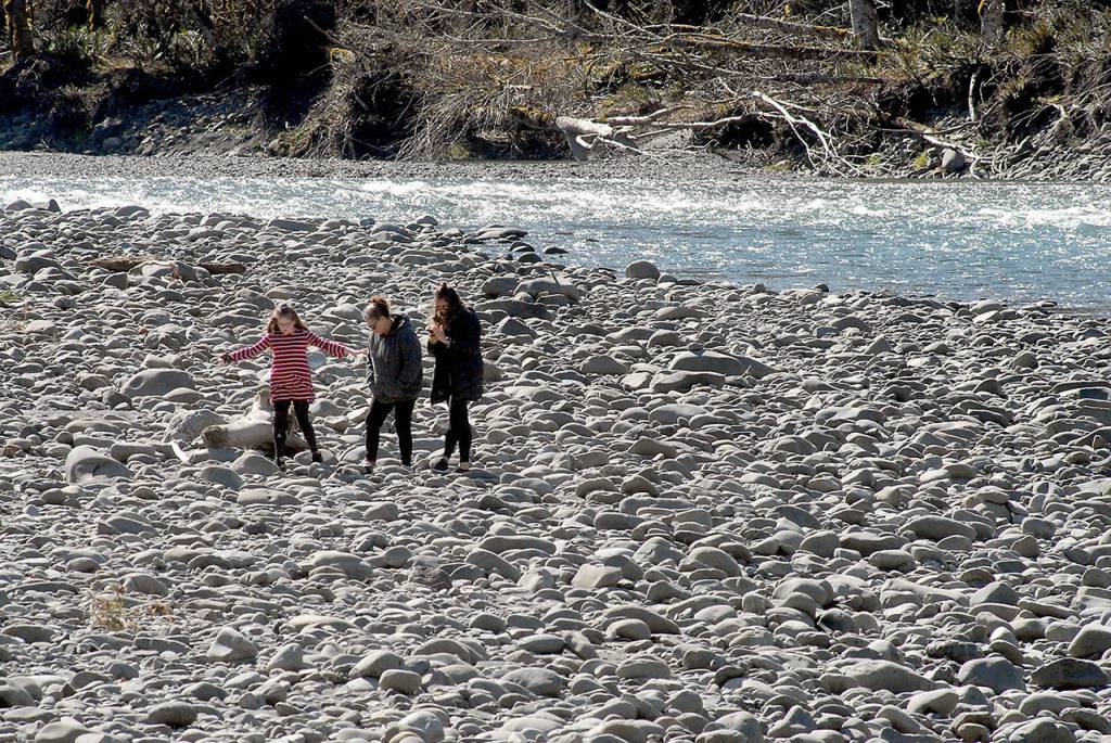 Maiah Taitingfong, 11, picks her way through a boulder field along the Elwha River in Olympic National Park on Saturday, followed by her grandmother, Lovena Taitingfong, and mother, Janee Taitingfong, all of Bremerton. The trio was taking advantage of a sunny afternoon on the first weekend of the spring season.