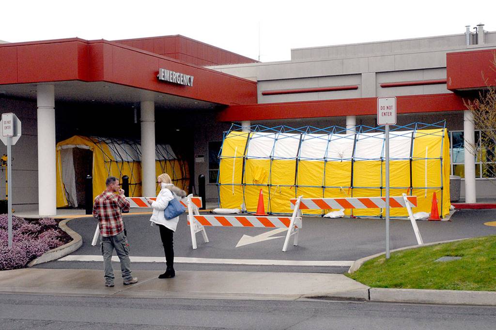 As a sign of preparation for an uptick in coronavirus cases, two tents were set up Tuesday at Olympic Medical Center in Port Angeles to screen patients, said Kevin Denton, Olympic Medical Center disaster preparedness coordinator, at the briefing.