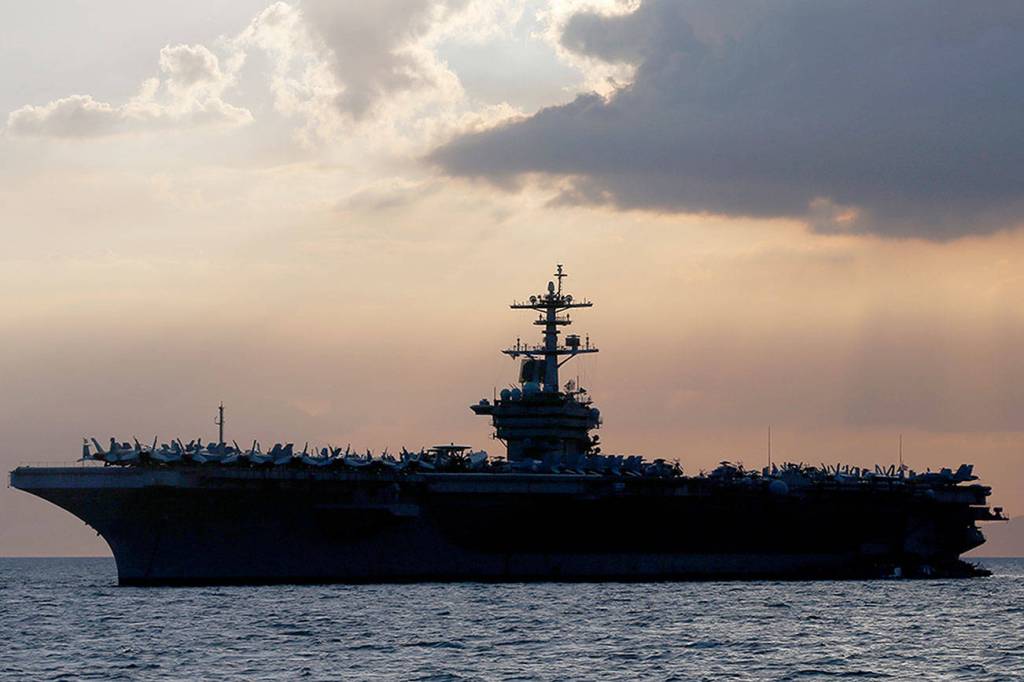 In this April 13, 2018, file photo, the USS Theodore Roosevelt aircraft carrier is anchored off Manila Bay west of Manila, Philippines. The captain of the U.S. Navy aircraft carrier facing a growing outbreak of the coronavirus is asking for permission to isolate the bulk of his roughly 5,000 crew members on shore, which would take the warship out of duty in an effort to save lives. The ship is docked in Guam (Bullit Marquez/Associated Press file)