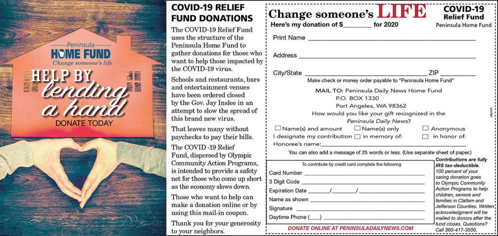 John Brewer, Port Angeles, $500. In honor of the hardworking Peninsula Daily News staffers who are informing the public about the local impact of the COVID-19 virus. And thank you, PDN, for reactivating the Peninsula Home Fund as the COVID-19 Relief Fund.