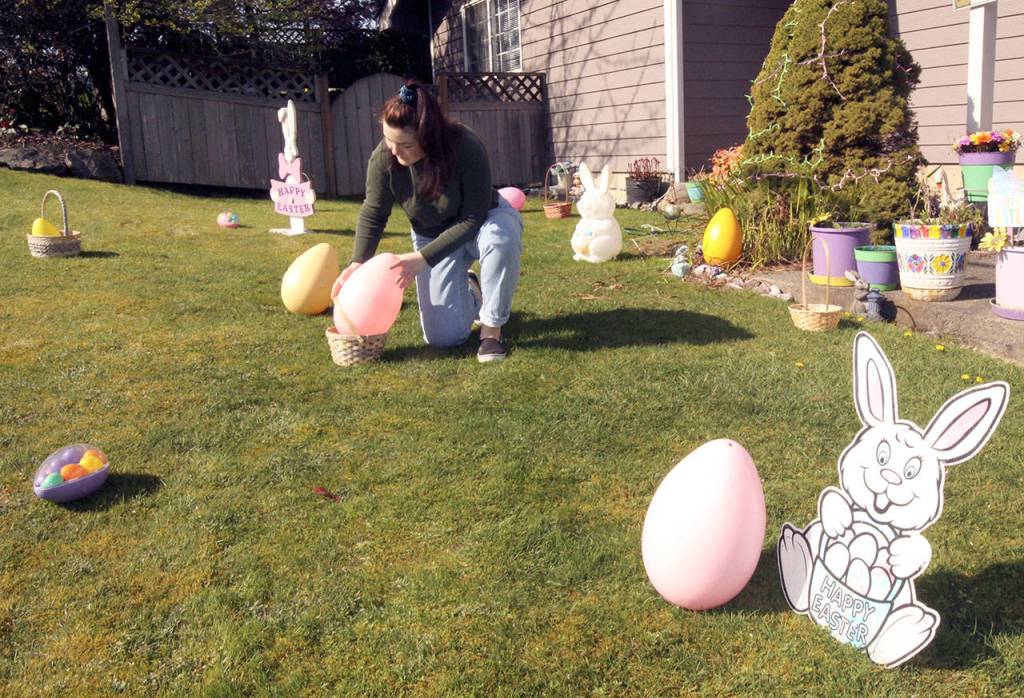 Olivia Wray, 16, arranges the large Easter eggs in the front yard.