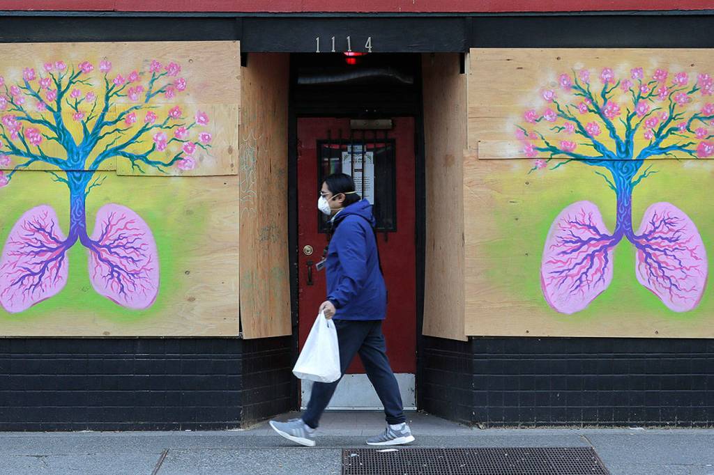 A pedestrian wearing a mask walks past paintings featuring lungs and a tree by Burgandy Viscosi on the boarded-up Re-Bar nightclub and theatre Tuesday, April 14, 2020, in downtown Seattle. Streets and sidewalks in the area were quiet Tuesday as most people in the city are staying and working at home due to the outbreak of the coronavirus. (Ted S. Warren/The Associated Press)