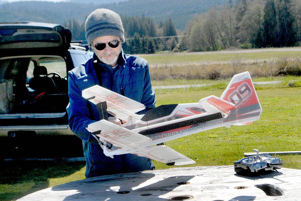 PORT ANGELES — Pilot Dan Fitzgerald of Port Angeles makes adjustments on a model airplane before takeoff Saturday, April 11, 2020, at the Olympic Radio Controlled Modelers airfield near William R. Fairchild International Airport in Port Angeles.