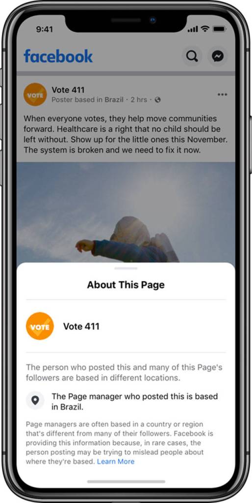 The new policy will apply to popular pages about elections, entertainment and other topics and will stamp every post they make on Facebook and Instagram with its origin. For instance, an Instagram account targeting U.S. voters but based in Brazil will have every post labeled with “Based in Brazil.” Users then can swipe to find out more information about the account.