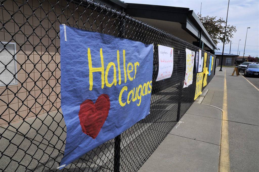 Jaysa Hill, a fourth-grade teacher at Helen Haller Elementary School, hands out a homework packet to a Haller student in April. (Michael Dashiell/Olympic Peninsula News Group file)