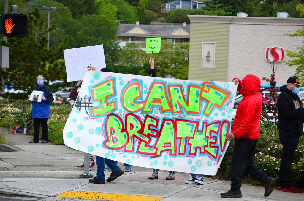 In Port Angeles, about 50 people braved a cold wind at 3 p.m. at the corner of Golf Course Road and First Street to hold signs saying “I can’t breathe” and “BLM.” Other signs evoked Philando Castile, another Minnesota black man who was killed by police in 2016.