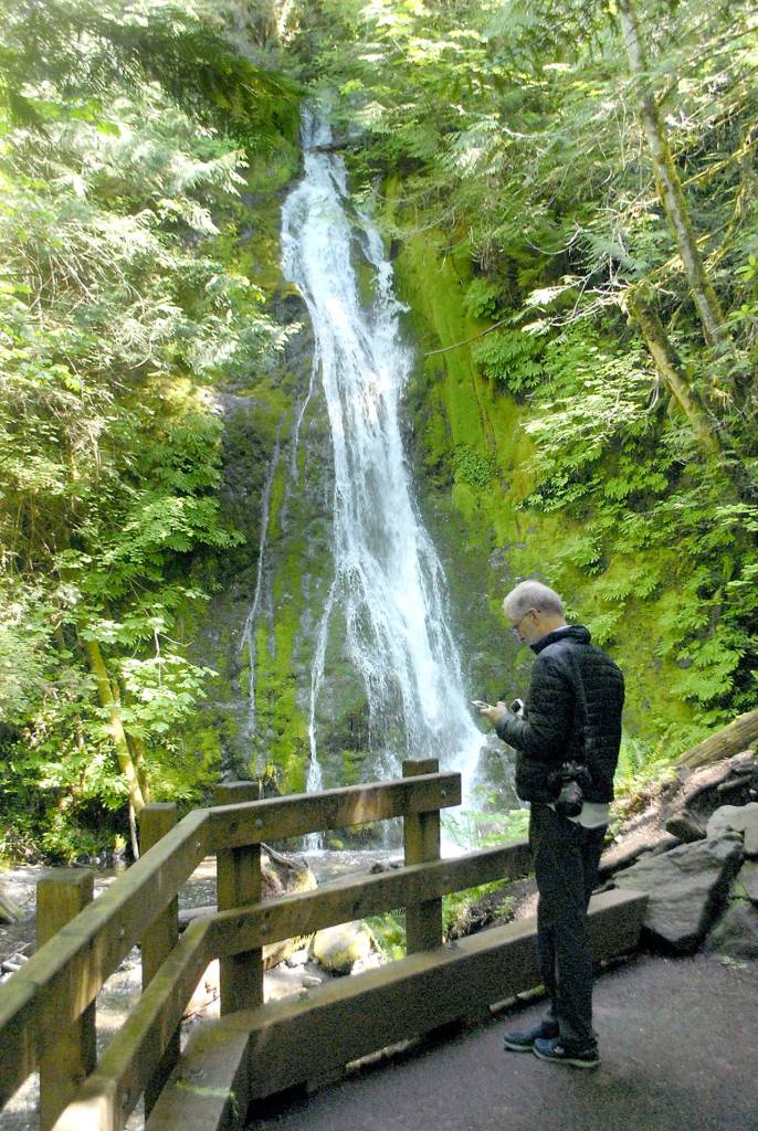 OLYMPIC NATIONAL PARK — Frank Wuren of Silverdale checks his cellphone at the base of Madison Creek Falls on the north edge of Olympic National Park in the Elwha River Valley west of Port Angeles last week.