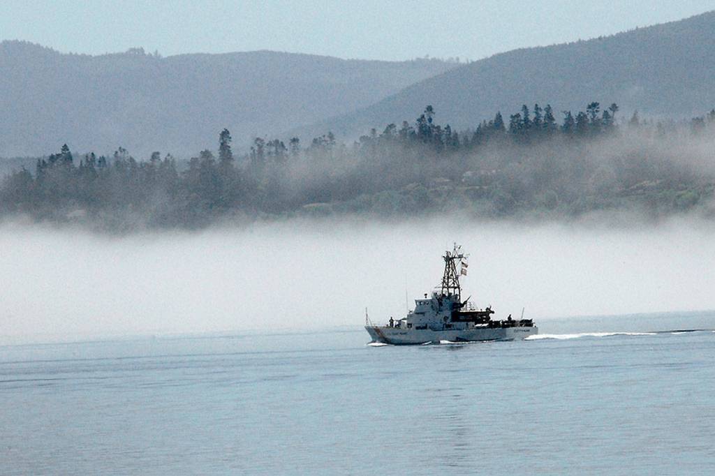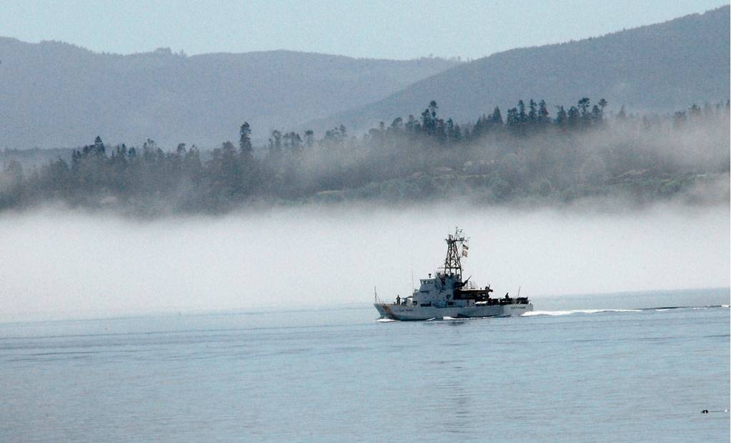 The U.S. Coast Guard cutter Cuttyhunk sails across Port Angeles Harbor on Thursday, June 25, 2020, against a backdrop of fog hugging the shoreline.
