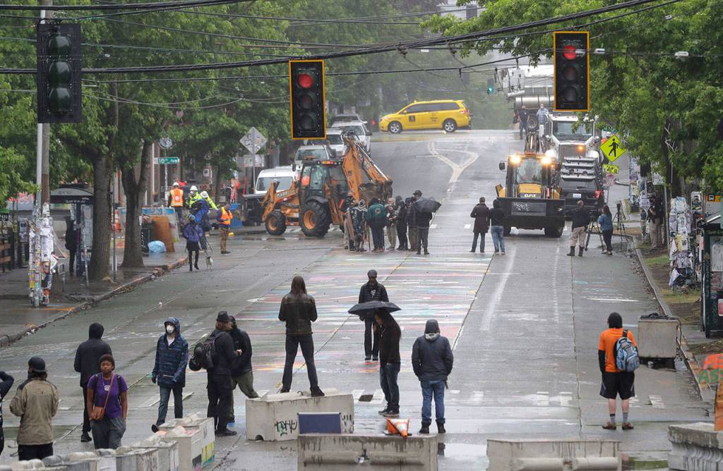 SEATTLE — Seattle city crews used heavy equipment Tuesday to remove makeshift barriers around the city’s “occupied” protest zone following two fatal shootings in the area.