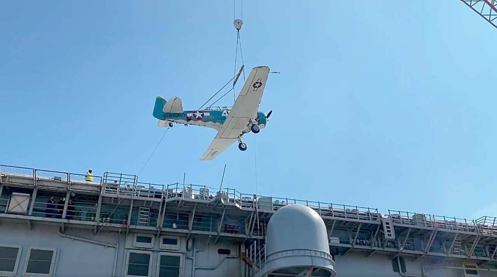 John Johnson’s T-6 airplane is loaded aboard the USS Essex on July 25 for its journey to Pearl Harbor for the 75th commemoration of the end of War War II in the Pacific Ocean in late August. (Photo courtesy of Dave Richardson)