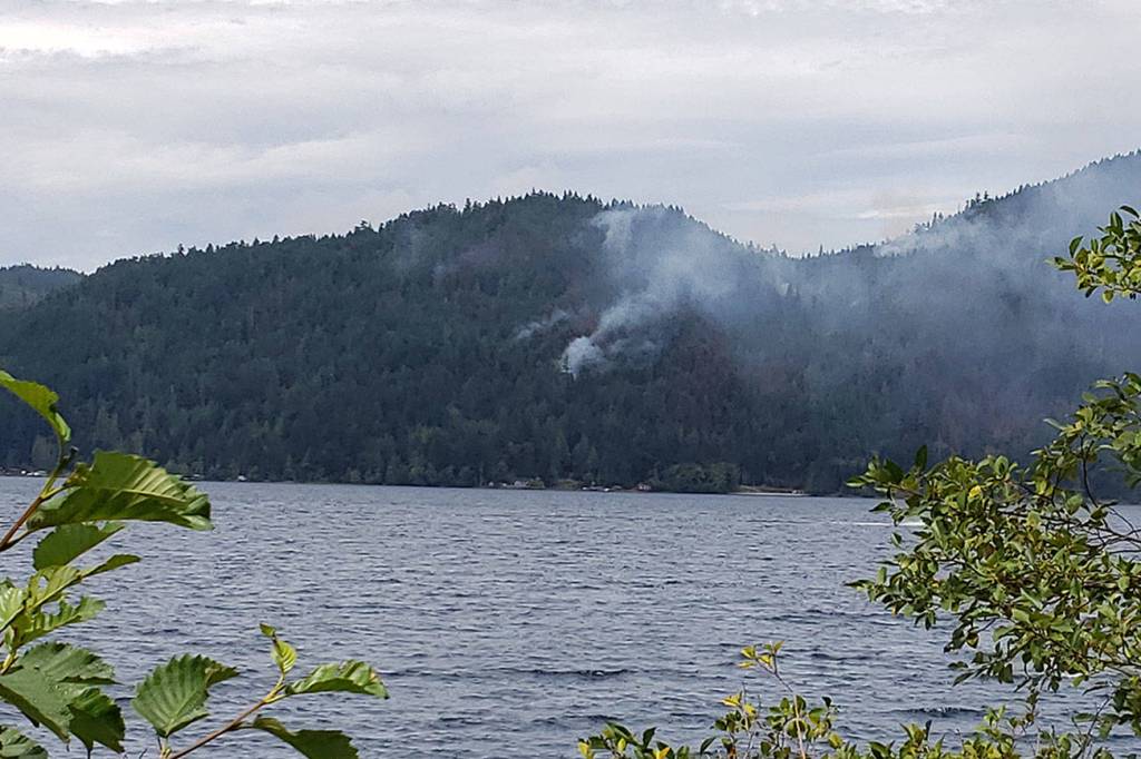 The East Beach Road Fire burns above Lake Crescent in Olympic National Park on Sunday, Aug. 2, 2020, as seen from a U.S. Highway 101 pull-off area. (Laura Foster/Peninsula Daily News)