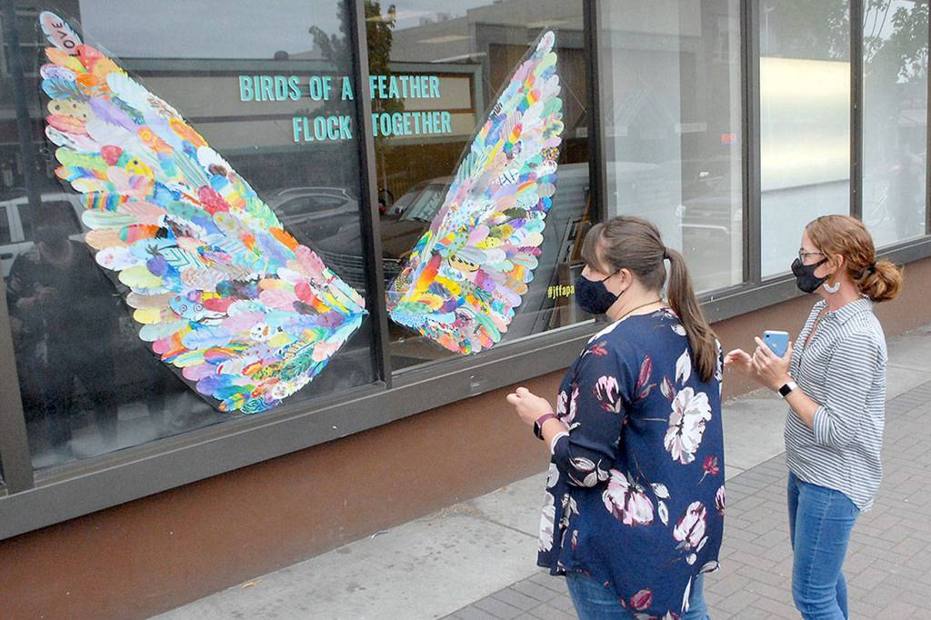 Kari Chance, left, the administrative manager for the Juan de Fuca Foundation for the Arts, and Executive Director Kayla Oakes admire their work after they installed a pair of paper wings in the front window of the building that once housed Maurices at First and Oak streets in downtown Port Angeles.