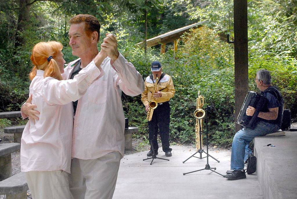 Steven Goldberg and his wife, Lorelli Anderson, both of Sequim, dance to music provided by John Zuerner on saxophone and Joe Shipani on accordion during a pop-up concert at the outdoor stage at Railroad Bridge Park near Sequim on Wednesday, Aug. 19, 2020.