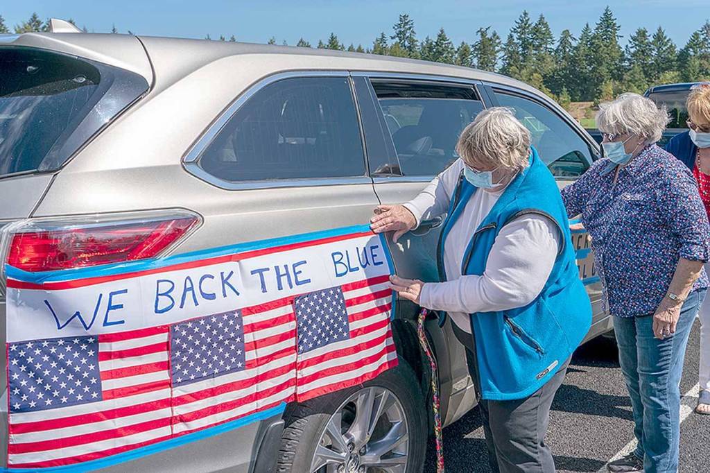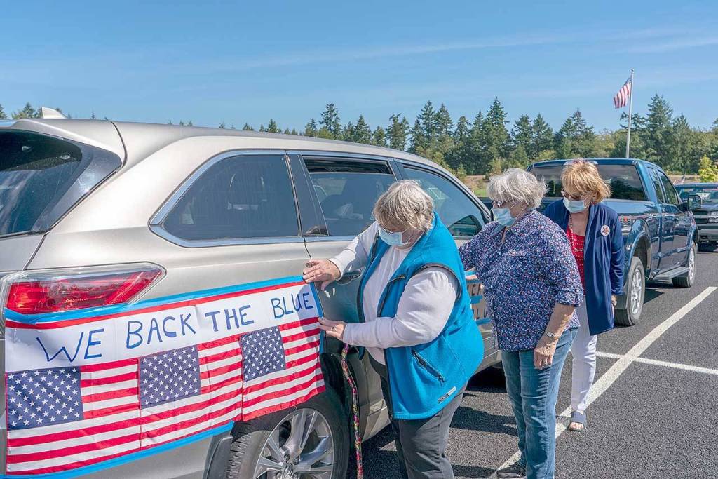 Linda Hinds, left, Kathy Campbell, middle and Bobbi Vandecar, all from Port Townsend, put the finishing touches on the decoration added to their car to show support for police and other law enforcement in a rally on Sunday at HJ Carroll Park.
